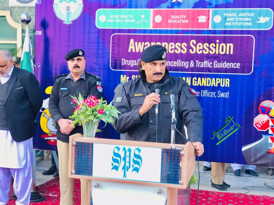 (باخبر سوات ڈاٹ کام) منشیات کی روک تھام اور ٹریفک آگاہی کے حوالے سے ایس پی ایس سکول اینڈ کالج رحیم آباد میں سیمینار کا انعقاد کیا گیا، جس میں ڈسٹرکٹ پولیس آفیسر سوات شفیع اللہ گنڈاپور نے بطورِ مہمانِ خصوصی شرکت کی۔ اس موقع پر ایس ڈی پی اُو سٹی امجد خان سمیت دیگر پولیس افسران، کالج پرنسپل محمد خلیل قاضی اور دیگر اساتذہ کرام بھی ہمراہ موجود تھے۔ ڈی پی اُو سوات نے سیمینار سے خطاب کرتے ہوئے کہا کہ ہمارا ایک ہی نعرہ ہے کہ ”نشے سے انکار اور زندگی سے پیار۔“ اس کے بارے میں آگاہی کیلئے تعلیمی اداروں میں سیمینارز منعقد کئے جارہے ہیں، تاکہ طلبہ کو منشیات سے بچاکر ان کا مستقبل محفوظ بنا یا جائے۔ انہوں نے کہا کہ تعلیمی اداروں یا ان کے اطراف میں کسی قسم کی منشیات فروشی یا استعمال کرنے والوں کیساتھ آہنی ہاتھوں سے نمٹا جائے گا۔