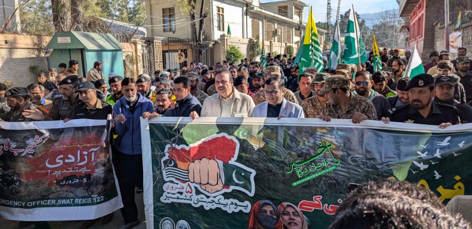 (باخبر سوات ڈاٹ کام)صوبے کے دیگر حصوں کی طرح سوات میں بھی یوم یکجہتی کشمیر منایا گیا۔ ڈپٹی کمشنر سوات سلیم جان مروت کی زیر نگرانی، ضلعی انتظامیہ سوات کی جانب سے یوم یکجہتی کشمیر کے موقع پر کشمیری عوام سے اظہارِ یکجہتی کے لیے ایک خصوصی ریلی اور علامتی واک کا انعقاد کیا گیا اور کشمیری شہدا کو خراج عقیدت پیش کرنے کے لئے ایک منٹ کی خاموشی اختیار کی گئی۔
